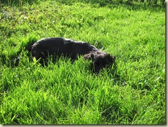 Efter hemkomst har bl.a. husse klippt gräset, ivrigt påhejad av 3 hundar. Jag har roat (?) mig med dammsugning och liknande. Till slut blir även ett litet svart troll trött, men inte trött nog att inte kika lite när matte tar fram kameran!